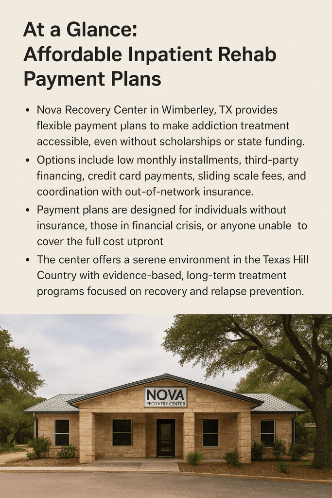 When considering addiction treatment at a reputable inpatient rehab facility like Nova Recovery Center in Wimberley, TX, one of the most common concerns is cost. Many individuals and families seek help but face financial challenges, especially when there are no available scholarships or state-funded options. If you’re searching with the keyword “inpatient rehab payment plan,” you’re not alone. Accessing professional help for drug or alcohol addiction shouldn’t be burdened by cost, and that’s why Nova Recovery Center offers flexible payment plans designed to make healing more attainable for everyone.