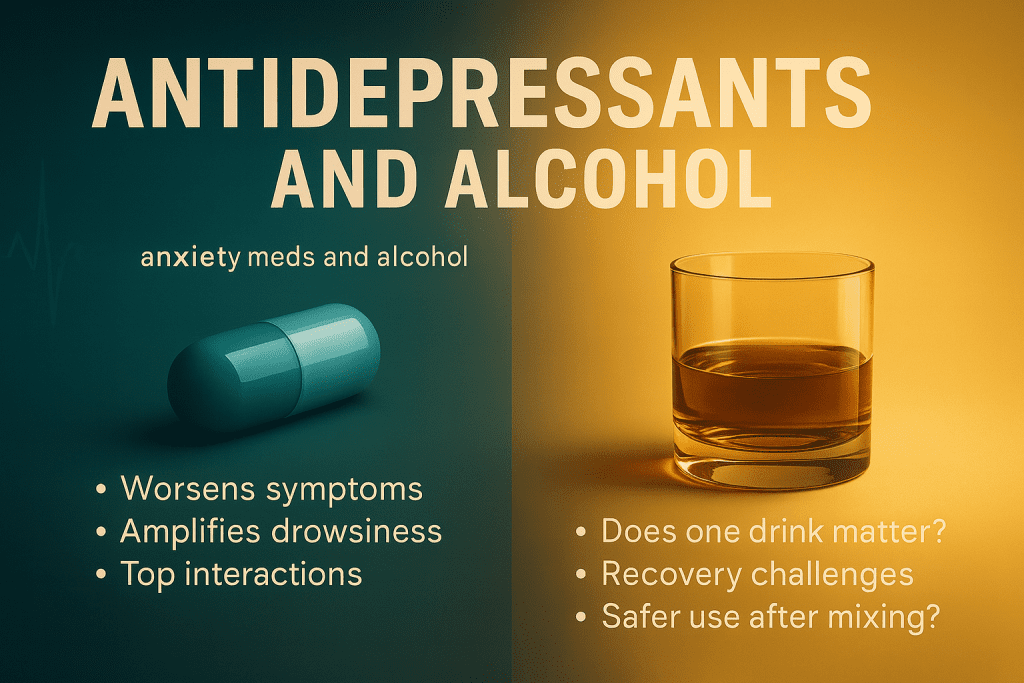 Antidepressants and alcohol infographic — risks of drinking and antidepressants, dangers of mixing anxiety meds and alcohol, and safer recovery choices.