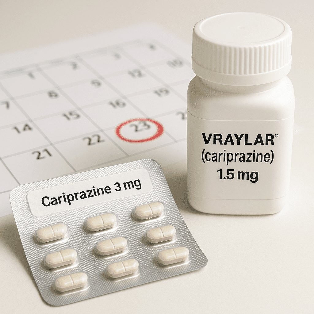 Cariprazine modulates dopamine and serotonin signaling (notably D2/D3 and 5-HT1A/5-HT2A receptors). Rather than “slamming the brakes,” it stabilizes activity—helping reduce hallucinations and disorganized thinking, and smoothing mood symptoms in bipolar illness or when augmenting antidepressants in MDD. The drug and its active metabolites have a very long half-life (~91 hours; metabolites ~1–3 weeks), so changes in dose roll in gradually.