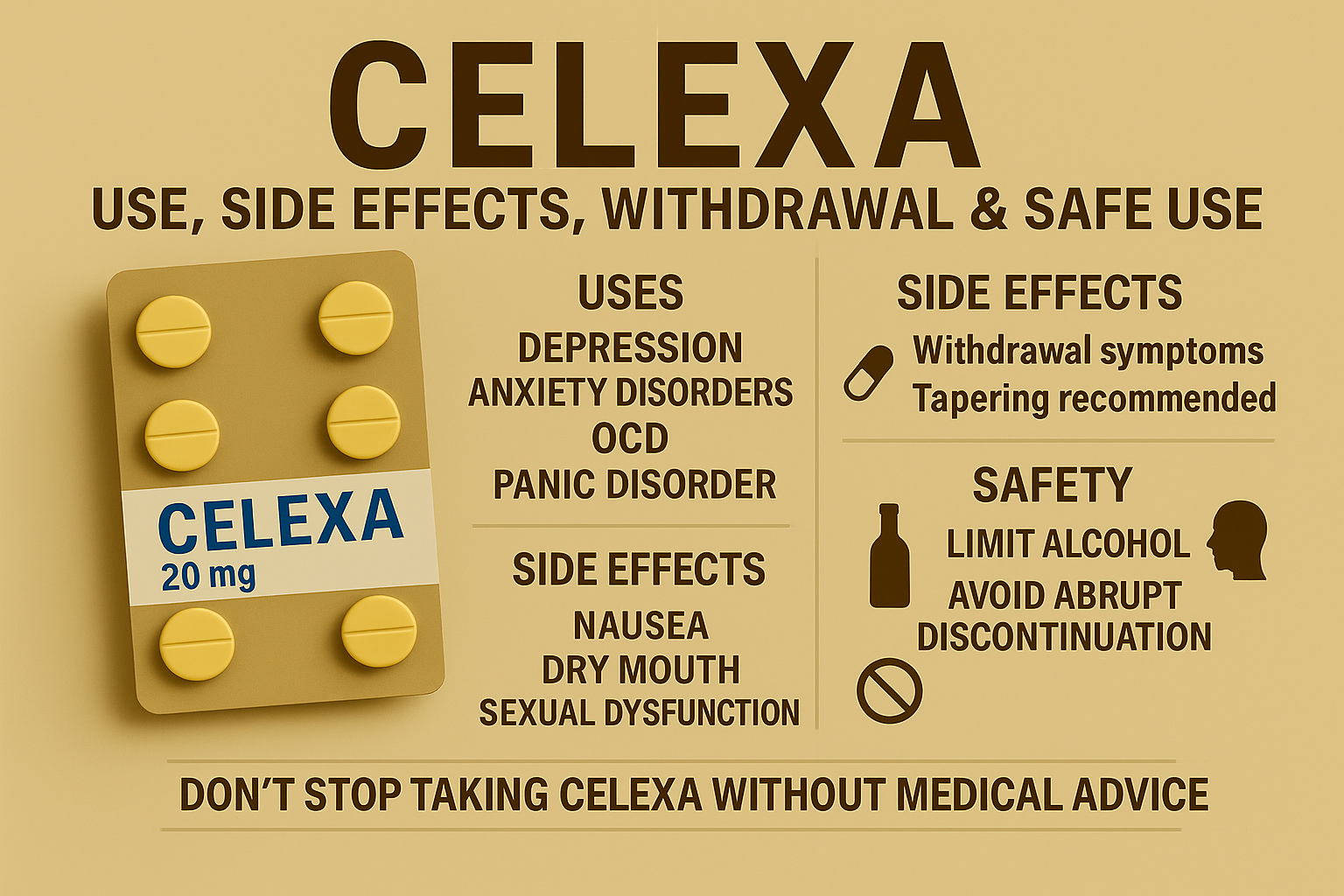 The information on this page is provided for educational purposes only and should not be used as a substitute for professional medical advice, diagnosis, or treatment. Celexa (citalopram) and other prescription medications must only be taken under the guidance of a licensed healthcare provider. Do not begin, adjust, or stop your medication without consulting your doctor. If you experience severe side effects, withdrawal symptoms, or thoughts of self-harm, call 911 in the United States or seek emergency medical care immediately. For free, confidential support with mental health concerns, you can call or text 988 to connect with the Suicide & Crisis Lifeline, available 24/7.