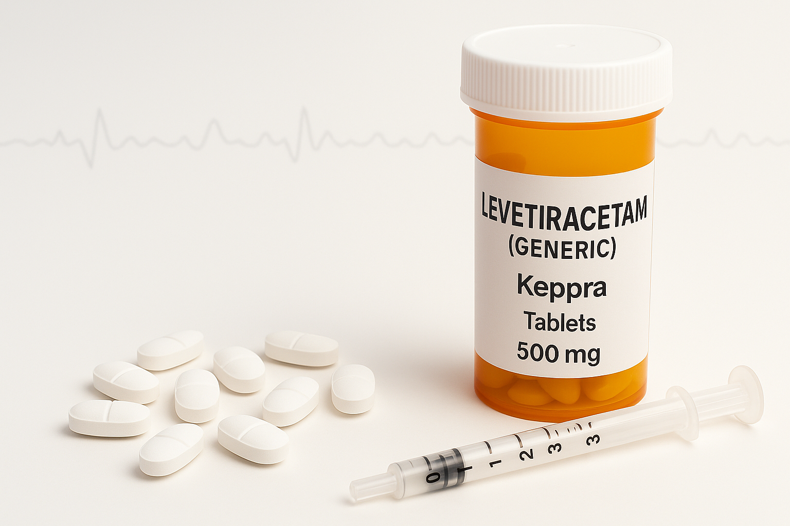 Levetiracetam (Keppra) tablets with oral solution syringe and soft EEG waveform—anti‑seizure medication for focal, myoclonic, and generalized tonic‑clonic seizures.