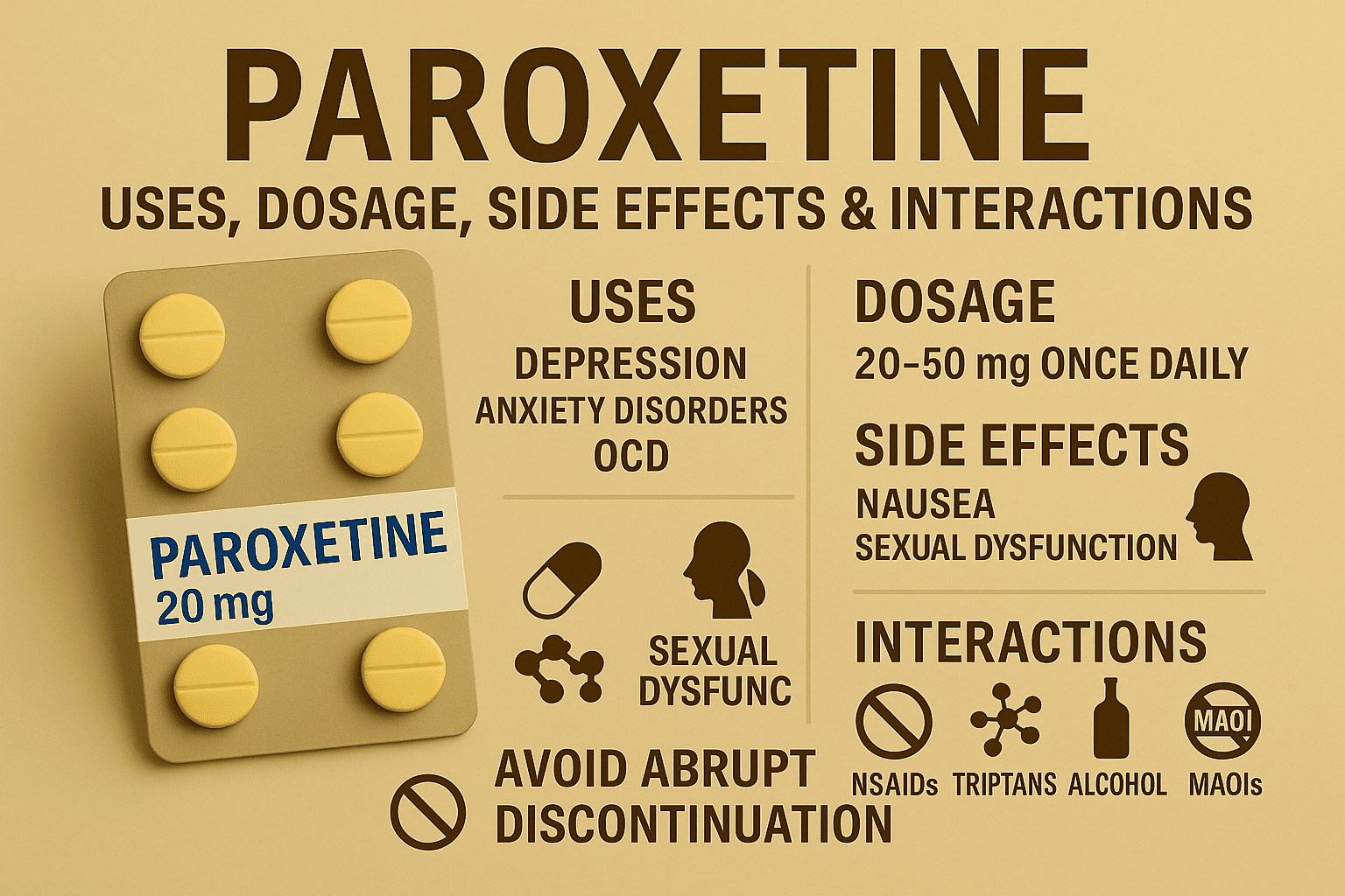 Paxil (paroxetine) is an SSRI antidepressant that increases serotonin levels in the brain. It helps regulate mood, reduce anxiety, and improve symptoms of depression, panic disorder, social anxiety, and obsessive-compulsive disorder.