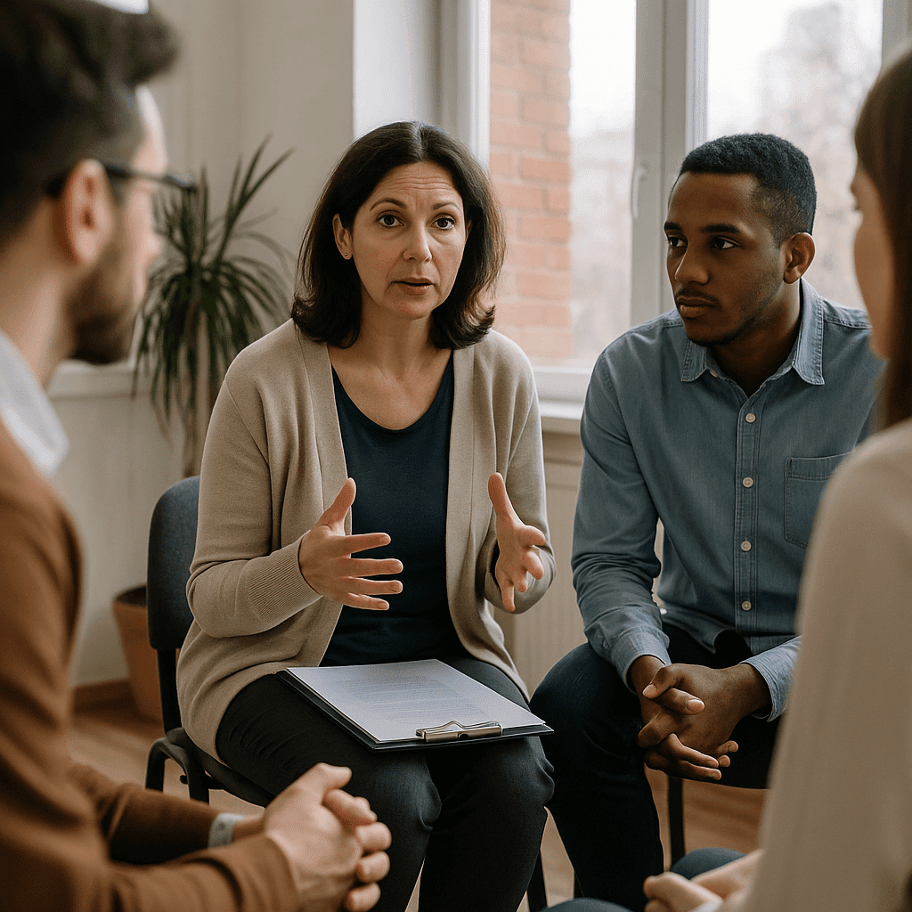 A supportive therapy group session at a modern outpatient recovery center in San Antonio, where people engage in discussion with a counselor in a bright, comfortable room.